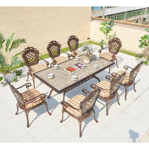 Технические характеристики: Обеденный комплект из литого алюминия состоит из стола и восьми кресел с подлокотниками. Стол с прямоугольной столешницей, декорированный орнаментом. Комплект не требует специального ухода. Устойчивость к воздействию влаги, солнечных лучей и низких температур. Не подвержен образованию коррозии. Упаковка рассчитана на 2 кресла. Подушки не входят в комплект и приобретаются отдельно.