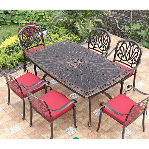 Технические характеристики: Обеденный комплект из литого алюминия состоит из стола и шести кресел с подлокотниками. Стол с овальной столешницей, декорированной орнаментом. В центре столешницы отверстие для установки зонта. Комплект не требует специального ухода. Устойчив к воздействию влаги, солнечных лучей и низких температур. Не подвержен образованию коррозии. Упаковка рассчитана на 6 кресел. Подушки не входят в комплект и приобретаются отдельно.