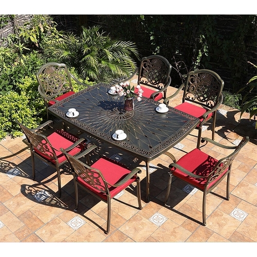 Технические характеристики: Обеденный комплект из литого алюминия состоит из стола и шести кресел с подлокотниками. Стол с овальной столешницей, декорированной орнаментом. В центре столешницы отверстие для установки зонта. Комплект не требует специального ухода. Устойчив к воздействию влаги, солнечных лучей и низких температур. Не подвержен образованию коррозии. Упаковка рассчитана на 4 кресла. Подушки не входят в комплект и приобретаются отдельно.