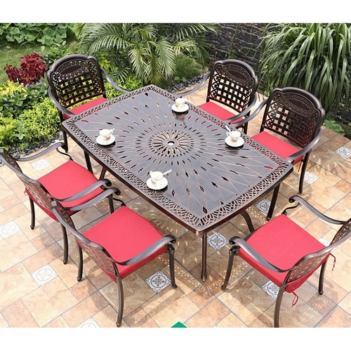 Технические характеристики: Обеденный комплект из литого алюминия состоит из стола и шести кресел с подлокотниками. Стол с овальной столешницей, декорированной орнаментом. В центре столешницы отверстие для установки зонта. Комплект не требует специального ухода. Устойчив к воздействию влаги, солнечных лучей и низких температур. Не подвержен образованию коррозии. Упаковка рассчитана на 6 кресел. Подушки не входят в комплект и приобретаются отдельно.