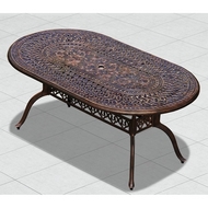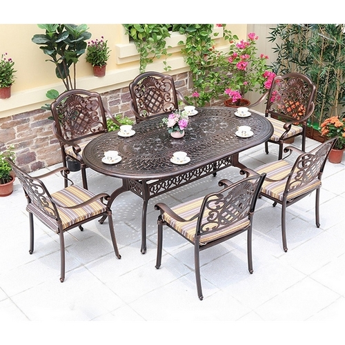 Технические характеристики: Обеденный комплект из литого алюминия состоит из стола и шести кресел с подлокотниками. Стол с овальной столешницей, декорированной орнаментом. В центре столешницы отверстие для установки зонта. Комплект не требует специального ухода. Устойчив к воздействию влаги, солнечных лучей и низких температур. Не подвержен образованию коррозии. Упаковка рассчитана на 4 кресла. Подушки не входят в комплект и приобретаются отдельно.