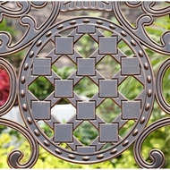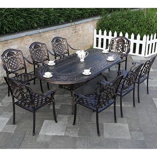 Технические характеристики: Обеденный комплект из литого алюминия состоит из стола и восьми кресел с подлокотниками. Стол с овальной столешницей, декорированной орнаментом. В центре столешницы отверстие для установки зонта. Комплект не требует специального ухода. Устойчив к воздействию влаги, солнечных лучей и низких температур. Не подвержен образованию коррозии. Упаковка рассчитана на 4 кресла. Подушки не входят в комплект и приобретаются отдельно.
