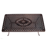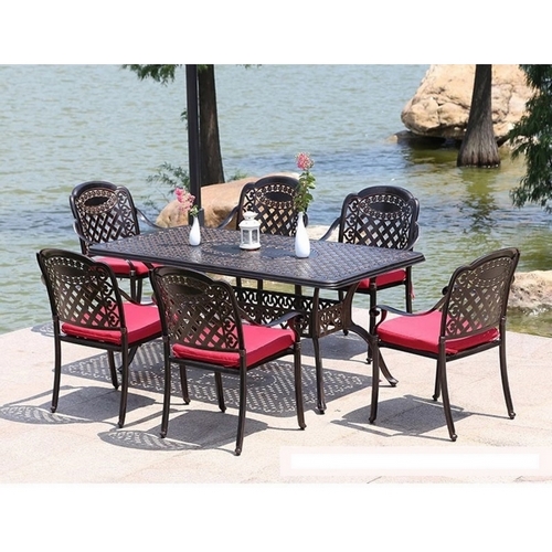 Технические характеристики: Обеденный комплект из литого алюминия состоит из стола и шести кресел с подлокотниками. Стол с прямоугольной столешницей, декорированный орнаментом. В центре столешницы отверстие для установки зонта. Комплект не требует специального ухода. Устойчивость к воздействию влаги, солнечных лучей и низких температур. Не подвержен образованию коррозии. Подушки не входят в комплект и приобретаются отдельно.