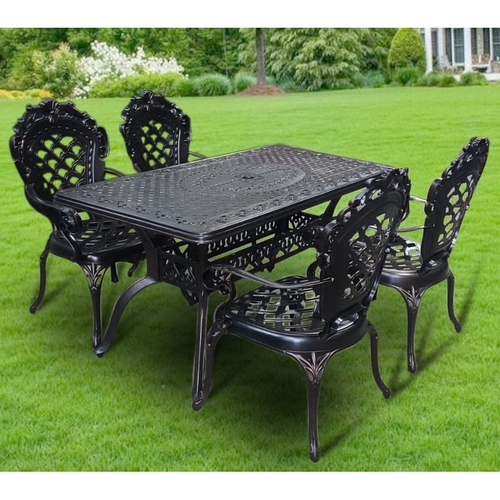 Технические характеристики: Обеденный комплект из литого алюминия состоит из стола и четырех кресел с подлокотниками. Стол с прямоугольной столешницей, декорированной орнаментом. В центре столешницы отверстие для установки зонта. Комплект не требует специального ухода. Устойчив к воздействию влаги, солнечных лучей и низких температур. Не подвержен образованию коррозии. Упаковка рассчитана на 2 кресла. Подушки не входят в комплект и приобретаются отдельно.