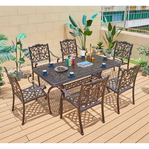 Технические характеристики: Обеденный комплект из литого алюминия состоит из стола и шести кресел с подлокотниками. Стол с прямоугольной столешницей, декорированный орнаментом. В центре столешницы отверстие для установки зонта. Комплект не требует специального ухода. Устойчивость к воздействию влаги, солнечных лучей и низких температур. Не подвержен образованию коррозии. Упаковка рассчитана на 4 кресла. Подушки не входят в комплект и приобретаются отдельно.