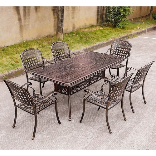 Технические характеристики: Обеденный комплект из литого алюминия состоит из стола и шести кресел с подлокотниками. Стол с прямоугольной столешницей, декорированный орнаментом. В центре столешницы отверстие для установки зонта. Комплект не требует специального ухода. Устойчивость к воздействию влаги, солнечных лучей и низких температур. Не подвержен образованию коррозии. Упаковка рассчитана на 6 кресел. Подушки не входят в комплект и приобретаются отдельно.