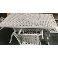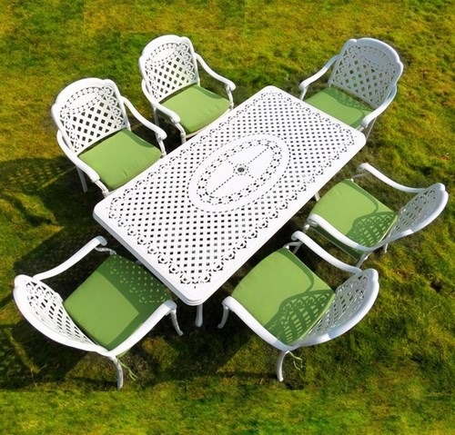 Дополнительно: Комплект состоит из шести стульев и прямоугольного столика из алюминия. Стол и стулья украшены изящным узором. Выполнен из прочного литого алюминия, не боится перепадов температур, повышенной влажности. Подходит для длительного использования на улице. Подушки не входят в комплект!