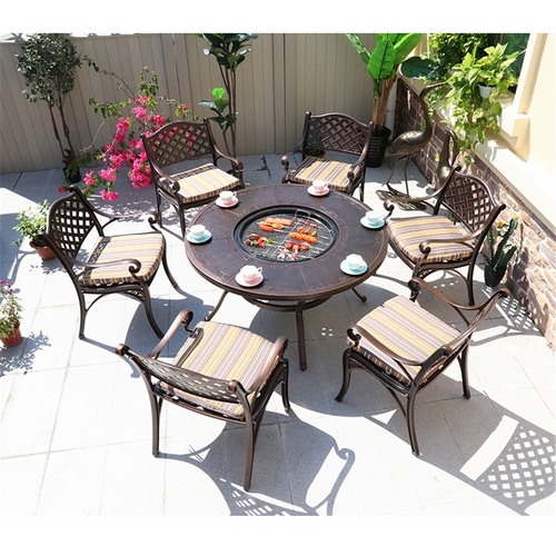 Технические характеристики: Обеденный комплект из литого алюминия состоит из стола и четырех кресел с подлокотниками. Широкий стол с круглой столешницей, декорированный орнаментом, и мангалом по центру. Мангал при необходимости можно закрыть декорированной крышкой. В комплект поставки также входит сетчатая крышка, щипцы, гриль, сетка для угля и сетка для пищи. Комплект не требует специального ухода. Устойчивость к воздействию влаги, солнечных лучей и низких температур. Не подвержен образованию коррозии. Упаковка кресел рассчитана на 2 штуки. Подушки не входят в комплект и приобретаются отдельно.