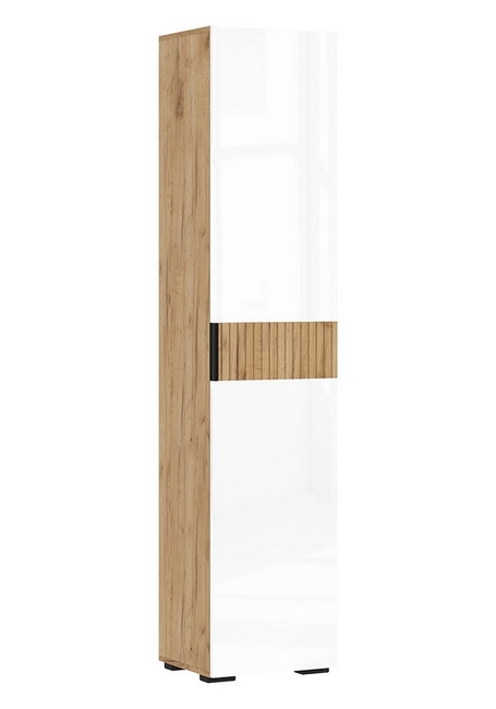 Особенности: Пенал Роджина 400 (белый глянец, дуб крафт) компактный и функциональный элемент мебели. Подходит для хранения различных вещей. Узкий и вертикальный дизайн. Дверцы - распашные. Выдвижная штанга для вешалок. Металлические ручки. Механизм Push-to-open.