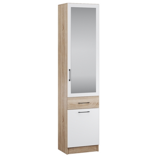 Особенности Пенала с зеркалом Денвер: Комбинированный шкаф-пенал Денвер с зекальным фасадом. Содержит набор полок за дверцей с зеркалом, ящик и закрытую вместительную нишу внизу. Возможность установки в малогабаритном помещении.