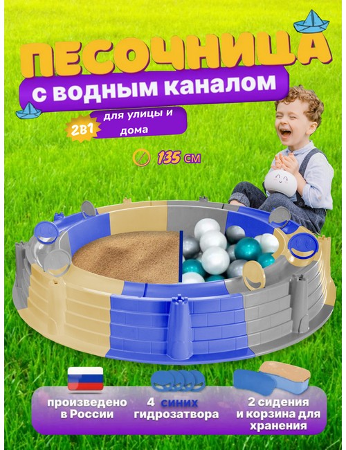 Технические характеристики: Песочница детская сборная с двумя сидениями (серый, синий, бежевый). Универсальный и многофункциональный игровой комплекс для детей, который легко трансформируется из песочницы в бассейн и даже в сухую игровую зону с шариками. Яркая круглая конструкция с двумя сидениями и водным каналом станет любимым местом для игр на даче, во дворе или в помещении. Наполняется водой для летнего освежения благодаря гидрозатворам и водному каналу. Специальный желоб создает эффект водной речки, добавляя увлекательный элемент в игру. Каждое сиденье выдерживает нагрузку до 100 кг. Легко собирается и разбирается, компактно хранится, легкий вес и удобная транспортировка. Песочница детская сборная с двумя сидениями подарит детям часы увлекательных игр, развивая творчество, воображение и физическую активность.