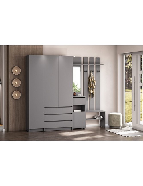 Технические характеристики: Прихожая Бали комплект 12 (графит). Функциональный мебельный гарнитур для прихожей, ориентированный на создание обширной и хорошо организованной системы хранения. Включает вешалку с зеркалом и трехстворчатый шкаф. Шкаф оснащен распашными дверцами, а ящики вешалки и трехстворчатого шкафа - роликовыми направляющими. Комплект обеспечивает раздельное хранение для всех категорий вещей: от объемной одежды и обуви до аксессуаров и сезонных предметов, создавая при этом целостную и упорядоченную композицию. Прихожая Бали комплект 12 - это решение для просторных прихожих, где необходима максимальная вместительность и четкая систематизация, воплощенная в сдержанном современном дизайне.