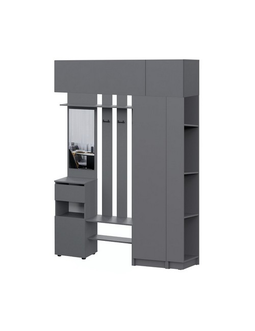 Технические характеристики: Прихожая Бали комплект 16 (графит). Сбалансированный мебельный ансамбль для организации прихожей, предлагающий ключевые элементы хранения в лаконичном дизайне. Включает вертикальный пенал, вешалку с зеркалом, угловой элемент и два навесных шкафа. Шкафы оснащены распашными дверцами, а ящики вешалки — роликовыми направляющими для плавной работы. Комплект позволяет эффективно распределить одежду, обувь и аксессуары, используя вертикальное и угловое пространство, создавая при этом ощущение порядка и визуальной легкости. Прихожая Бали комплект 16 — это практичное и завершенное решение для современного интерьера, идеально подходящее для средних по размеру прихожих, где важны и функциональность, и эстетика.