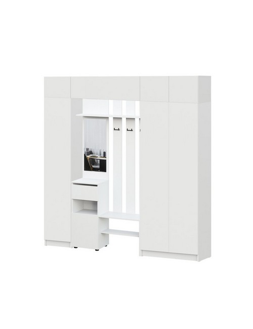 Технические характеристики: Прихожая Бали комплект 17 (белый). Многофункциональный мебельный ансамбль для прихожей, сочетающий разные типы хранения для комплексной организации пространства. Включает вертикальный пенал, вешалку с зеркалом, двухстворчатый шкаф, широкий и стандартный навесные шкафы, а также компактный верхний модуль. Шкафы оснащены распашными дверцами, а ящики вешалки — роликовыми направляющими. Комплект предлагает гибкую систему для размещения одежды, обуви, сумок и различных аксессуаров, эффективно используя как напольное, так и настенное пространство. Прихожая Бали комплект 17 — это универсальное решение для тех, кто ценит глубокую организацию, модульность и современный лаконичный дизайн, способный адаптироваться под разные потребности в хранении.
