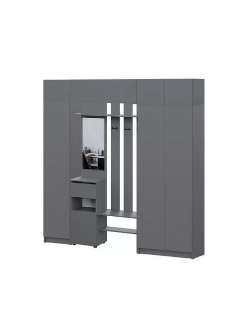 Технические характеристики: Прихожая Бали комплект 17 (графит). Многофункциональный мебельный ансамбль для прихожей, сочетающий разные типы хранения для комплексной организации пространства. Включает вертикальный пенал, вешалку с зеркалом, двухстворчатый шкаф, широкий и стандартный навесные шкафы, а также компактный верхний модуль. Шкафы оснащены распашными дверцами, а ящики вешалки — роликовыми направляющими. Комплект предлагает гибкую систему для размещения одежды, обуви, сумок и различных аксессуаров, эффективно используя как напольное, так и настенное пространство. Прихожая Бали комплект 17 — это универсальное решение для тех, кто ценит глубокую организацию, модульность и современный лаконичный дизайн, способный адаптироваться под разные потребности в хранении.