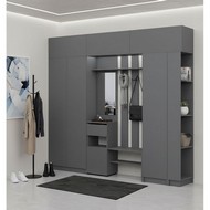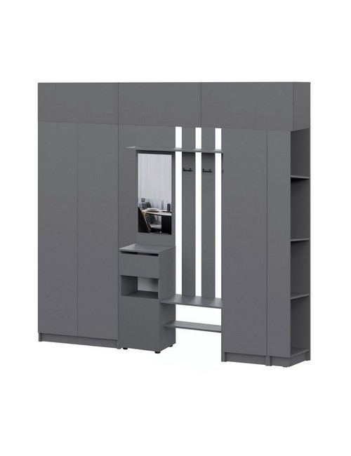 Технические характеристики: Прихожая Бали комплект 18 (графит). Многофункциональный мебельный ансамбль, предлагающий комплексное решение для организации пространства в прихожей. Включает вешалку с зеркалом, двухстворчатый шкаф, три верхних шкафа, угловое завершение и вертикальный пенал. Все шкафы оснащены распашными дверцами, а ящики вешалки — роликовыми направляющими для плавной работы. Комплект позволяет систематизировать хранение одежды, обуви, аксессуаров и сезонных вещей, эффективно используя как вертикальные, так и угловые плоскости для создания визуально целостной композиции. Прихожая Бали комплект 18 — это продуманное решение для тех, кто ценит глубокую функциональность, четкую организацию и сдержанный современный дизайн в едином стиле.