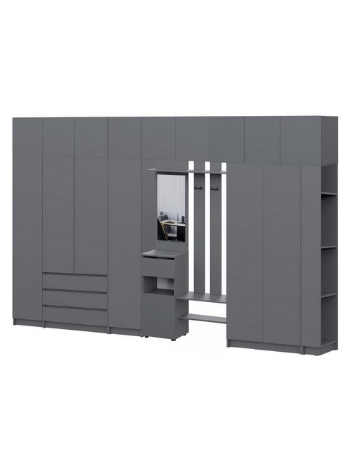 Технические характеристики: Прихожая Бали комплект 21 (графит). Масштабный мебельный гарнитур для организации просторной прихожей, предлагающий комплексную систему хранения. Включает вертикальный пенал, вешалку с зеркалом, угловой модуль, четыре навесных шкафа, два распашных шкафа и компактный верхний модуль. Все шкафы оснащены распашными дверцами, а ящики вешалки и трехстворчатого шкафа имеют роликовые направляющие. Ансамбль позволяет систематизировать все категории вещей: от верхней одежды и обуви до сезонных предметов и аксессуаров, создавая визуально целостное и упорядоченное пространство. Прихожая Бали комплект 21 - это профессиональное решение для большой семьи, где важны максимальная вместительность, четкая организация пространства и сдержанный современный дизайн.