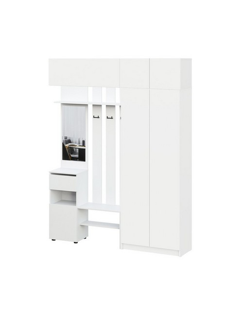 Технические характеристики: Прихожая Бали комплект 22 (белый). Сбалансированный мебельный ансамбль для средней прихожей, создающий функциональную зону для хранения и подготовки к выходу. Включает вешалку с зеркалом, навесной шкаф, двухстворчатый шкаф и широкий навесной модуль. Все шкафы имеют распашные дверцы, а ящики вешалки — роликовые направляющие для удобного использования. Комплект решает ключевые задачи: размещение верхней одежды и аксессуаров, хранение обуви и сезонных вещей, а также создание удобной зоны с зеркалом. Прихожая Бали комплект 22 — это практичное и эстетичное решение для современного интерьера, где необходимо компактно организовать пространство, сохранив ощущение порядка и легкости.