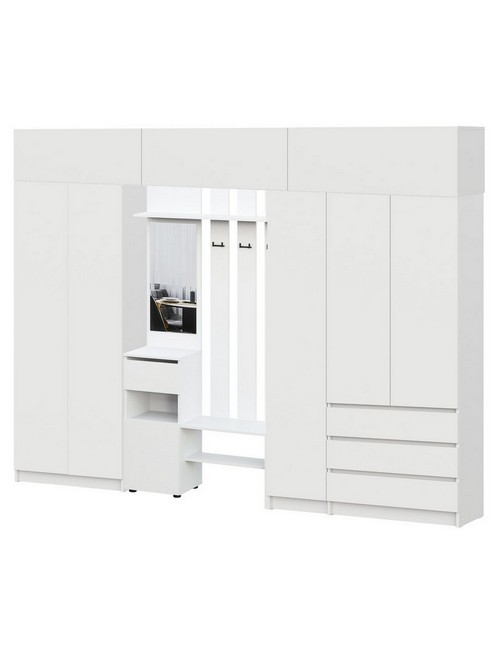 Технические характеристики: Прихожая Бали комплект 24 (белый). Функциональный мебельный гарнитур для прихожей с акцентом на вместительное вертикальное хранение. Включает вешалку с зеркалом, двухстворчатый и трехстворчатый шкафы, а также три широких верхних модуля. Шкафы оснащены распашными дверцами, а ящики вешалки и трехстворчатого шкафа — роликовыми направляющими. Комплект обеспечивает раздельное хранение одежды и обуви в нижней зоне, а также обширное пространство для сезонных или редко используемых вещей в верхней части, создавая сбалансированную и упорядоченную композицию. Прихожая Бали комплект 24 — это решение для тех, кому необходима максимальная вместимость и четкая систематизация в прихожей, без ущерба для современного и лаконичного внешнего вида.
