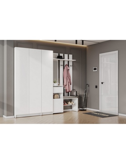 Технические характеристики: Прихожая Бали комплект 3 (белый). Функциональный мебельный гарнитур для прихожей, ориентированный на создание обширной и хорошо организованной системы хранения. Включает вешалку с зеркалом, двухстворчатый шкаф и пенал. Шкафы оснащены распашными дверцами, а ящики вешалки - роликовыми направляющими. Комплект обеспечивает раздельное хранение для всех категорий вещей: от объемной одежды и обуви до аксессуаров и сезонных предметов, создавая при этом целостную и упорядоченную композицию. Прихожая Бали комплект 3 - это решение для просторных прихожих, где необходима максимальная вместительность и четкая систематизация, воплощенная в сдержанном современном дизайне.