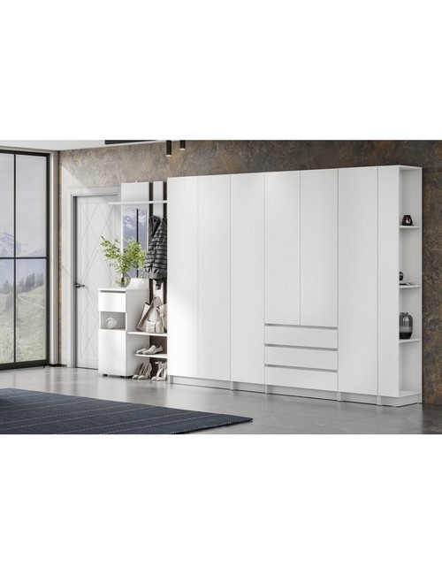 Технические характеристики: Прихожая Бали комплект 7 (белый). Функциональный мебельный гарнитур для прихожей, ориентированный на создание обширной и хорошо организованной системы хранения. Включает вешалку с зеркалом, трехстворчатый и двухстворчатый шкаф, пенал, а также угловое завершение. Шкафы оснащены распашными дверцами, а ящики вешалки и трехстворчатого шкафа - роликовыми направляющими. Комплект обеспечивает раздельное хранение для всех категорий вещей: от объемной одежды и обуви до аксессуаров и сезонных предметов, создавая при этом целостную и упорядоченную композицию. Прихожая Бали комплект 7 - это решение для просторных прихожих, где необходима максимальная вместительность и четкая систематизация, воплощенная в сдержанном современном дизайне.
