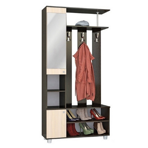 Особенности Прихожей Эконом: Открытая прихожая с зеркалом, тремя крючками для верхней одежды, полками для обуви и шкафчиком. Имеется полка для головных уборов.