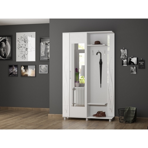 Особенности Прихожей Ирма-2: Прихожая Ирма включает в себя шкаф со штангой, полку для мелочей и открытую секцию с крючками под одежду, зонты и ключи. Компактный размер. Зеркальный фасад. Наполнение шкафа из евроштанги и двух полок. Открытая вешалка с тремя крючками. Изящный глянцевый рисунок.