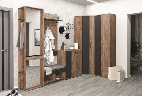 Дополнительно: Благодаря конструкции шкафов, тумб и вешалки у Вас появится место для хранения верхней одежды, сезонных аксессуаров, уличной и домашней обуви, домашних мелочей, а также зона для обувания. Мебель изготовлена из ЛДСП высокого качества и представлена в актуальном цветовом решении - сочетании дуба табачного и черного крафта. Комплектация прихожей Noto - пенал с зеркалом 05, шкаф угловой 03, шкаф для одежды 2-х дверный 02, мягкий элемент для тумбы 07, тумба для обуви высокая 04, тумба для обуви 01, вешалка настенная 06.