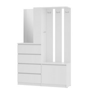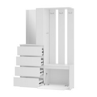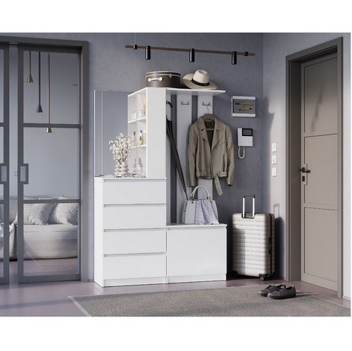 Особенности: Прихожая Симпл ПР-04 в белом цвете состоит из 4-х выдвижных ящиков, тумбы с откидной створкой, зеркала, открытых полок, надежных крючков для верхней одежды и верхней полки, материал корпуса/фасада - ЛДСП, шариковые направляющие на ящиках, сборка на обе стороны, компактный размер