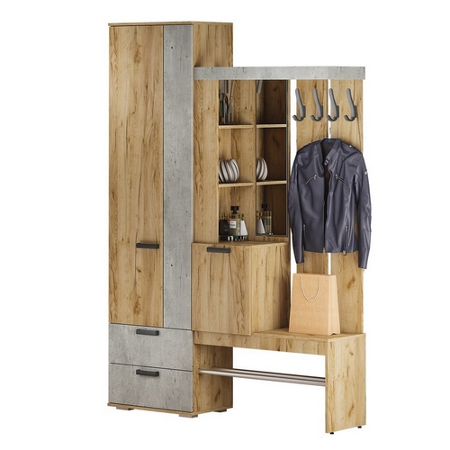 Особенности Прихожей Трамп: Прихожая оснащена открытой вешалкой с 4-мя крючками, зеркалом, тумбой, полкой для обуви и шкафом. Распашной шкаф со штангой для вешалок, полкой и двумя выдвижными ящиками.