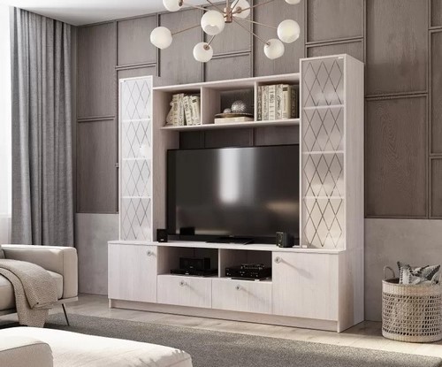 Дополнительно: Секция центральная Зарина ЦС-01 ясень белый - модульный компонент для стенки в гостиную. Мебель выполнена в классическом стиле. Стеклянные фасады декорированы рисунком. 2 ниши закрытые створкой. 2 выдвижных ящика. Большое количество открытых полок. Размер ниши под телевизор (ШхГхВ): 130х53.2х92.8 см. Шариковые направляющие ящиков обеспечивают полное, плавное и бесшумное выдвижение. Максимальная нагрузка на полку/ящик - 5 кг.