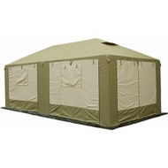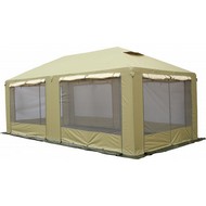 Технические характеристики: Шатер 4х3 Пикник-Люкс (хаки-бежевый). Просторный и функциональный шатер для комфортного отдыха на природе, охоты, рыбалки или проведения мероприятий. Модель сочетает высокую ветро- и влагозащиту, продуманную вентиляцию и возможность полной трансформации стенок. Каркас с нижним основанием повышает устойчивость и защищает от проникновения внутрь. Элементы каркаса надежно и быстро соединяются между собой с помощью удобных кнопок. Водостойкость 2000 мм водяного столба - надежная защита от сильного дождя, дополнительная герметизация предотвращает протекание, широкая замкнутая юбка защищает от задувания ветра и попадания влаги снизу, 8 прочных петель-оттяжек повышают ветроустойчивость, позволяя надежно закрепить шатер. Вентиляционный клапан в верхней части крыши снабжен антимоскитной сеткой и защитным козырьком, позволяет регулировать циркуляцию воздуха, предотвращая конденсат. Окна из прозрачной пленки расположены на двух противоположных боковых стенах, закрывающиеся шторки на молниях позволяют при необходимости затемнить окна или закрыть их от света. Тент крепится к каркасу стропами с пряжками и липучками, стенки сверху пришиты к тенту и крепятся к ножкам с помощью застежек-молний. В комплекте каркас, крыша с ножками, 2 сплошные стенки, 2 стенки с окнами и 4 стенки из антимоскитной сетки. Утяжелители и растяжки в комплект не входят, приобретаются отдельно. Шатер 4х3 Пикник-Люкс обеспечит максимальный комфорт в полевых условиях, защищая от дождя, ветра, солнца и насекомых.