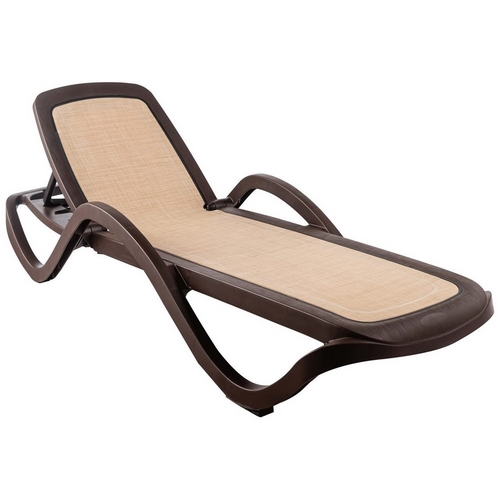 Технические особенности: цельный каркас из полипропилена с повышенной ударной прочностью, а также устойчивостью к перепадам температур, повышенной влажности и ультрафиолету, текстильное покрытие из ткани, изготовленной методом термосклейки полиэфирных нитей, ткань устойчива к износу, обладает высокой прочностью на разрыв, при этом достаточно вентилируется и не впитывает влагу, регулируемый наклон спинки - 5 положений, шезлонги одной модели штабелируются между собой, резиновые заглушки на ножках шезлонга предотвращают скольжения шезлонга, колеса для удобной и быстрой транспортировки.