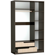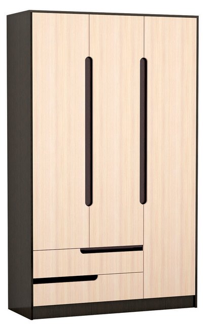 Технические характеристики: Шкаф оснащён тремя отделениями с распашными дверьми и двумя выдвижными ящиками. Внутри шкафа расположены четыре бельевых полки, одна антресольная полка и штанга для вешалок. Поставляется в разобранном виде.