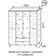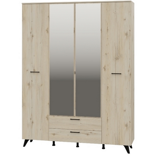 Технические характеристики: Четырёхдверный шкаф для одежды с зеркалом. Штанга для вешалок в центральном отделении, бельевые полки - в боковых. Два ящика на шариковых направляющих полного выдвижения. Петли с доводчиками на фасадах. Стильная фурнитура и ножки. Цвет может отличаться от представленного на фотографии.