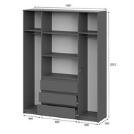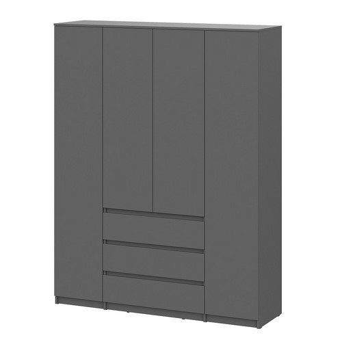 Особенности: Четырехдверный шкаф для одежды и белья Денвер в цвете графит с тремя выдвижными ящиками – это идеальное место хранения. Скрытая фурнитура. Направляющие роликовые. Штанга - 2 шт. Фурнитура в комплекте. Нагрузка на ящики 5 кг.