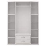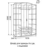 Технические характеристики: Шкаф оснащён тремя отделениями (двухдверным и двумя однодверными) и двумя выдвижными ящиками. Внутри двухдверного отделения - перекладина для вешалок и одна полка. Внутри каждого однодверного отделения - пять полок. Дверные петли с доводчиками. Регулируемые опоры. Ящики на шариковых направляющих полного выдвижения. Поставляется в разобранном виде.