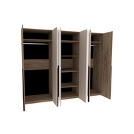 Особенности: Распашной 6-ти дверный шкаф для одежды и белья. Огранённые фацетом зеркала на фасадах шкафа в полный рост. Петли дверей с доводчиками. Высокие ручки из массива дерева. Опоры с возможностью регулировки. Крепится на стену за подвесы. Полки регулируются по высоте. Можно компоновать с другими модулями из серии мебели Кара.
