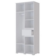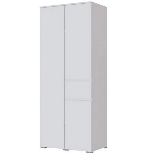 Двухстворчатый шкаф Плейона оснащем выдвижным ящиком, закрытыми полками и вешалом.