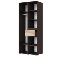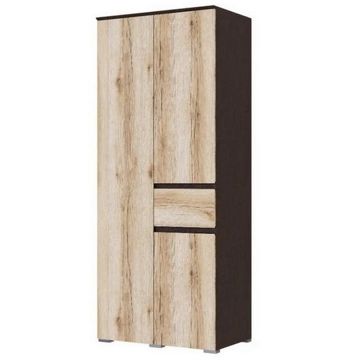 Двухстворчатый шкаф Плейона оснащем выдвижным ящиком, закрытыми полками и вешалом.