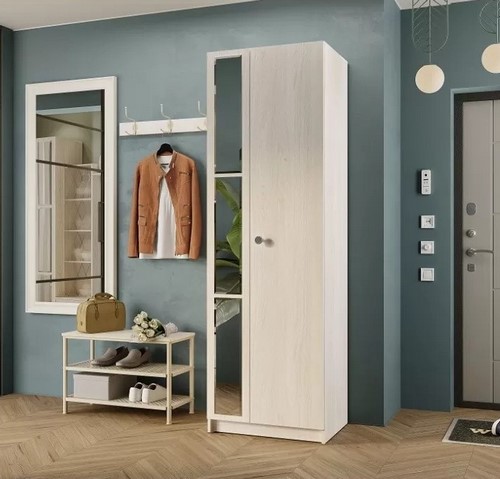 Дополнительно: Шкаф двухстворчатый Зарина ШК-01 ясень белый подойдет для гостиной, прихожей или спальни. Модуль комплектуется стационарной штангой и полкой. Створка декорирована составным зеркалом. Максимальная нагрузка на полку/штангу - 10 кг.