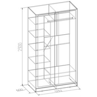 Технические характеристики: Шкаф оснащен стационарной штангой для вешалок, тремя полками, двумя нишами вверху и двумя внизу. Две двери, одна дверь с зеркалом. Зеркало проклеено сзади специальной защитной плёнкой (в случае если зеркало разобьётся, все осколки останутся на плёнке). В комплекте прилагаются шлегеля для дверей (комплект щёток с толстым ворсом, которые устанавливаются на профиль дверей шкафа-купе и приглушают удары дверей при закрывании, а также способствуют пыленепроницаемости). Дополнительно к шкафу можно приобрести карниз с подсветкой, брючницу и стеллаж.
