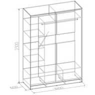 Технические характеристики: Шкаф оснащен стационарной штангой для вешалок, стеллажом для белья с тремя полками, двумя нишами вверху и тремя нишами внизу. Полки регулируются по высоте. Две двери, одна дверь с зеркалом. Зеркало проклеено сзади специальной защитной плёнкой (в случае если зеркало разобьётся, все осколки останутся на плёнке). В комплекте прилагаются шлегеля для дверей (комплект щёток с толстым ворсом, которые устанавливаются на профиль дверей шкафа-купе и приглушают удары дверей при закрывании, а также способствуют пыленепроницаемости). Дополнительно к шкафу можно приобрести карниз с подсветкой, брючницу и стеллаж.