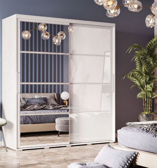 Технические характеристики: Фасад шкафа с зеркалом. Шкаф оснащен штангой для вешалок, полками и двумя выдвижными ящиками. Зеркала с фацетом.