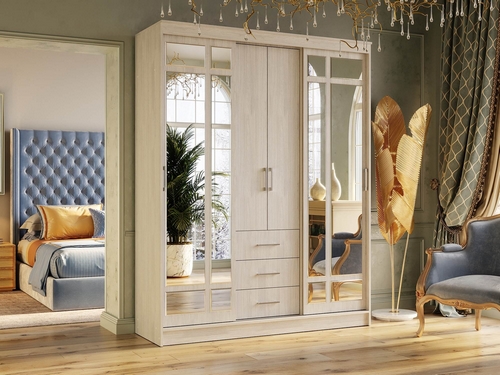 Технические характеристики: Шкаф оснащен 5 полками, 2 штангами для вешалок и 3 выдвижными ящиками. Двери шкафа украшены зеркалами. Максимальная нагрузка на одну полку - 15 кг. Максимальная нагрузка на один выдвижной ящик - 10 кг.