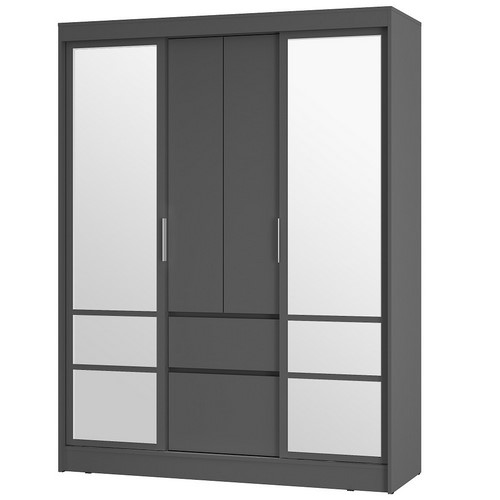 Особенности: Шкаф-купе Симпл ШКК-06 цвета графит оснащен 2-мя стационарными хромированными штангами, материал корпуса/фасада - ЛДСП, усиленные направляющие на ящиках, зеркальные вставки на фасадах, увеличенная глубина
