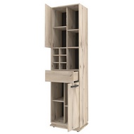 Технические характеристики: Крепится на стену за подвесы. Регулируемые опоры, которые помогут компенсировать неровности пола. Ручки из массива дерева. Ящик открывается за свес. Встроенная подсветка. Шкаф оснащен открытыми полками, борной нишей, выдвижным ящиком и двумя закрытыми секциями с полкой. Ящики на шариковых направляющих.