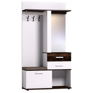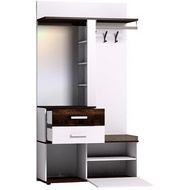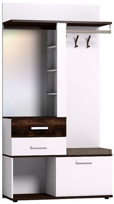 Комплектация: Крючки, стационарная штанга, открытые полки, выдвижные ящики, отделение за откидным фасадом, открытая ниша, зеркало с подсветкой. Встроенная светодиодная подсветка включается при помощи аккуратного кнопочного выключателя. Откидной фасад дополнительно фиксируется при закрывании магнитной защелкой.