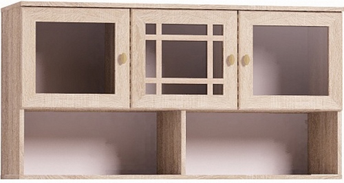 Технические характеристики: Шкаф оснащён 3 отделениями с распашными дверями и 2 открытыми нишами. Двери со стеклянными вставками (стекло тонированное). Высота открытых ниш - 23,5 см. Шкаф крепится к стене за подвесы. Шкаф можно навесить и открытыми нишами вверх. Максимальная нагрузка на шкаф до 80 кг. Рамочные фасады с раскладкой из профиля МДФ. Поставляется в разобранном виде.