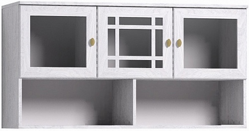Технические характеристики: Шкаф оснащён 3 отделениями с распашными дверями и 2 открытыми нишами. Двери со стеклянными вставками (стекло тонированное). Высота открытых ниш - 23,5 см. Шкаф крепится к стене за подвесы. Шкаф можно навесить и открытыми нишами вверх. Максимальная нагрузка на шкаф до 80 кг. Рамочные фасады с раскладкой из профиля МДФ. Поставляется в разобранном виде.